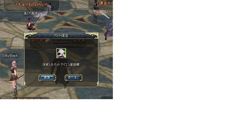 パンダ初死にしちゃいました。 あともう少しでlv3なので エルスでペット復活買いに行き 一番安いので 値段は50M><