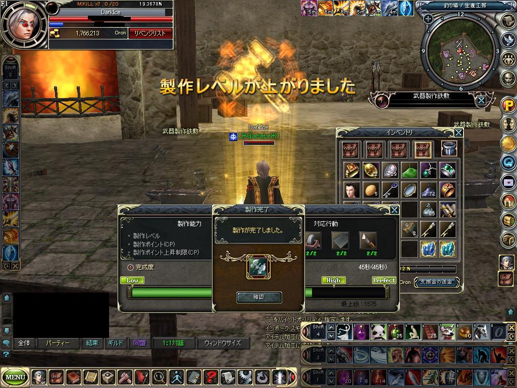>製作した時の経験値の入り方は作る武器のLVと完成した時の製品等級が大きく影響します。