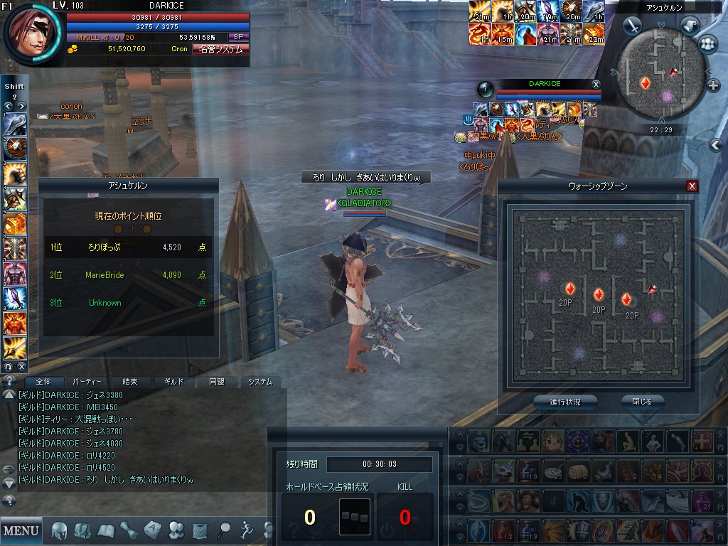 30分の前半終了 この辺で出てきたのがジェネ 同盟との連携がうまく進み始めたのか 比較的マークされにくいのか維持ベースの点数が良かった感じです。