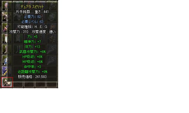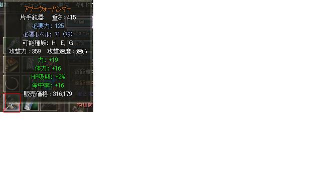 左が最近までつかってた ユニーク武器 補正もしょぼいですが、HP吸収6