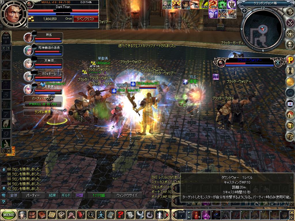しばらくするとフレの雷電さんのサブからテル入ってひまですねえ・・・wと 暇人二人になったので今度は集める側に変更死神さんもサブでソロッていたので参加 昨日PT一緒にしたカフェオレさんも放置から復帰で追加、天無双さんは雷電さんが強引に拉致w そしてPTMから誘って 最終フルになって雷電さんのおごりで和合注入、途中メンツの入れ替わりあったり死神さん爆死したりありましたが、気合の2時間で一気に50です。